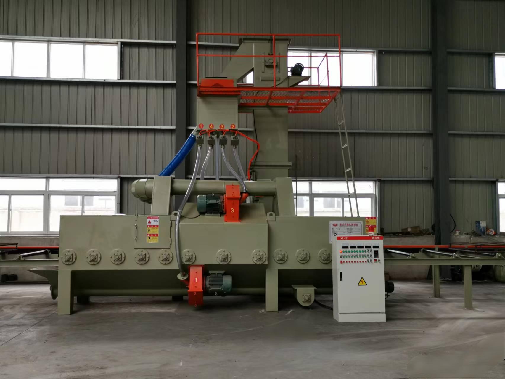 輥道式拋丸清理機是將工件吊掛在輸送輥道上,輥道輸送系統(tǒng)將工件向前輸送,當工件進入清理室時,拋丸器開始順序工作。經(jīng)過拋丸處理后,鋼材表面的氧化皮、污物及其它附著物被清理干凈,處理過的表面可達Sa2-2.5級。拋丸機的工作方式是連續(xù)循環(huán)進行的。