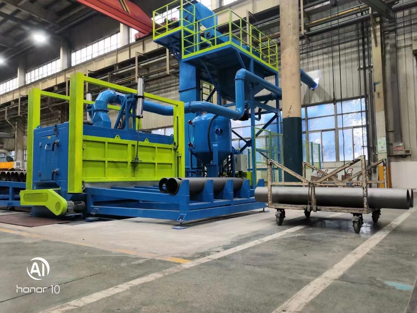特點:適用于直徑100-250mm的棒材及直徑160-3000mm的管材類(如蓄能器、液化氣瓶等)產品的外表面拋丸清理和強化,產品呈現(xiàn)出金屬光澤,以利于工件涂層的吸附能力,確保涂層品質,它具有清理效果好,效率高等優(yōu)點。